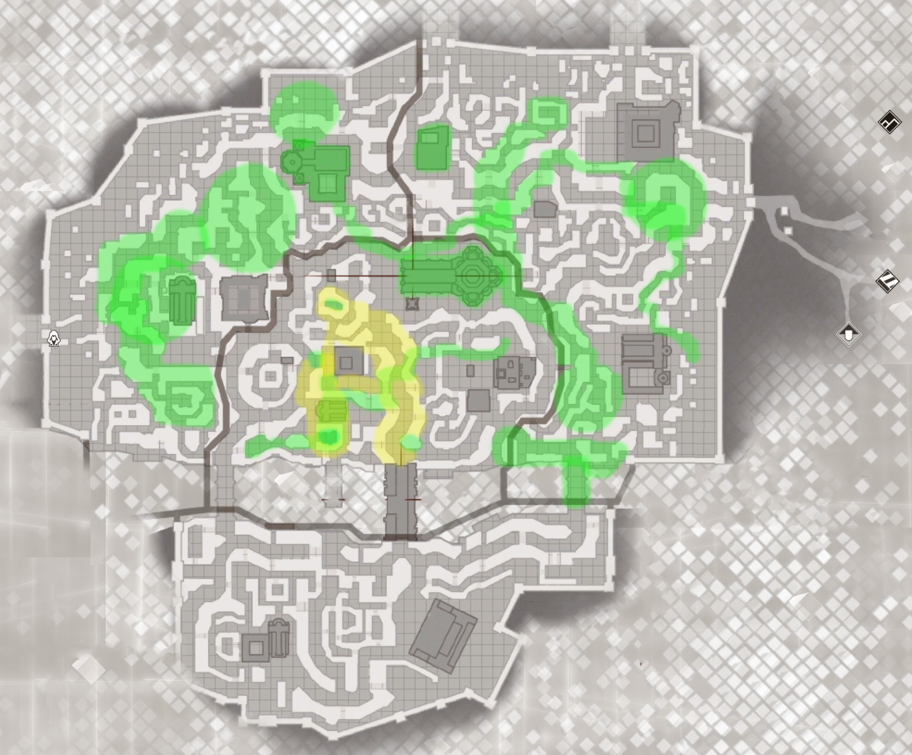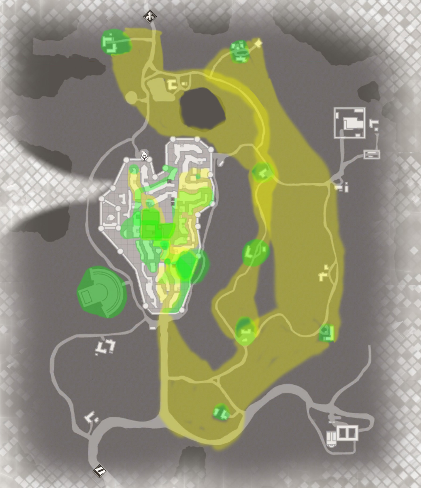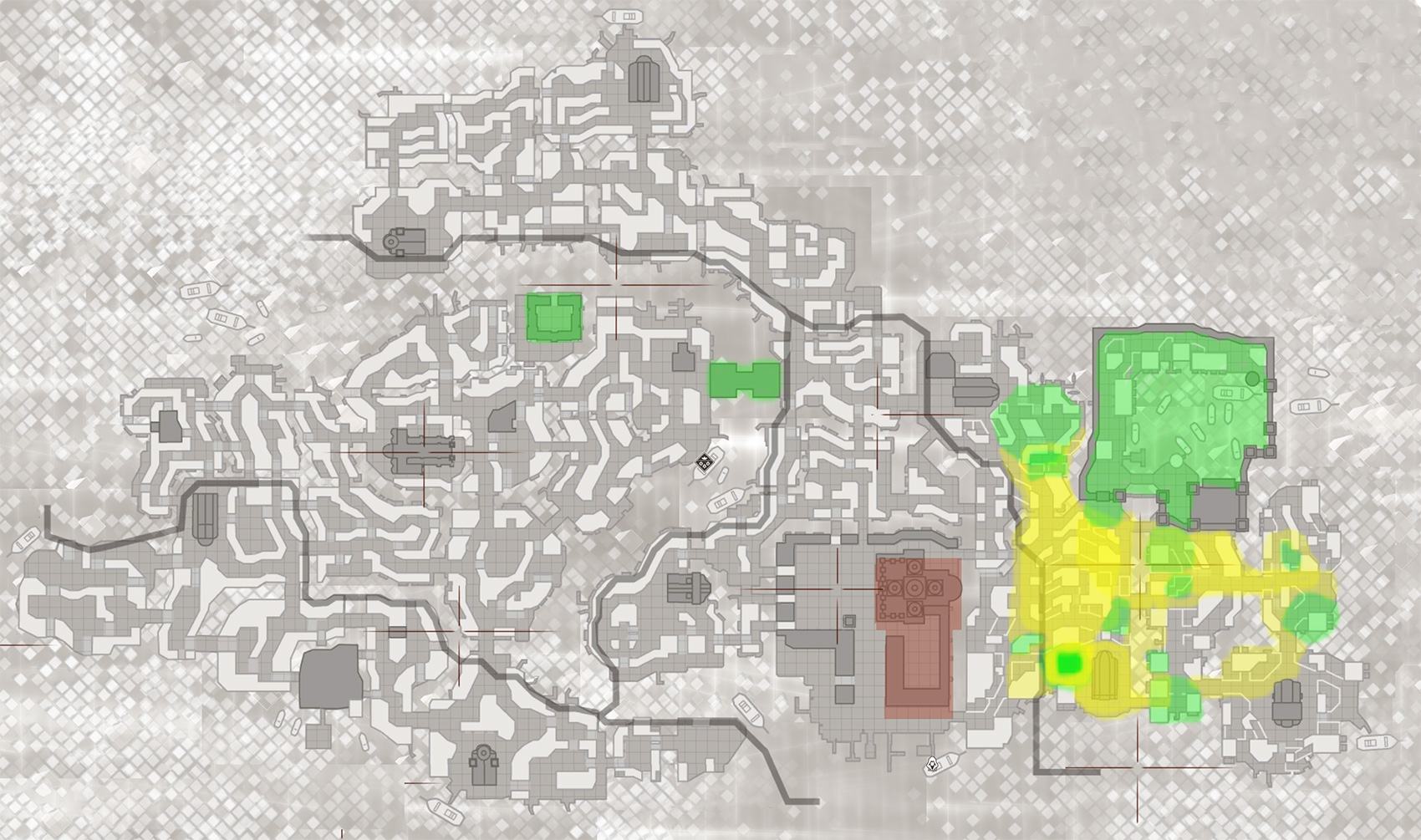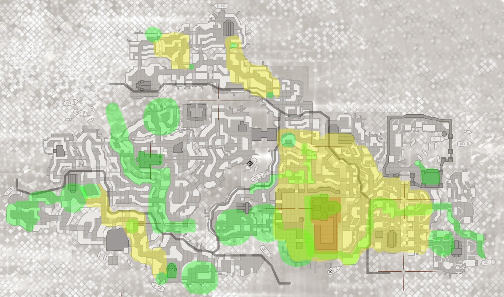 Green – Area that the player will pretty much 100% visit and explore because the mission design revolves around it (be it an infiltration sandbox area, search area, a particular path of a character we need to follow, etc.)