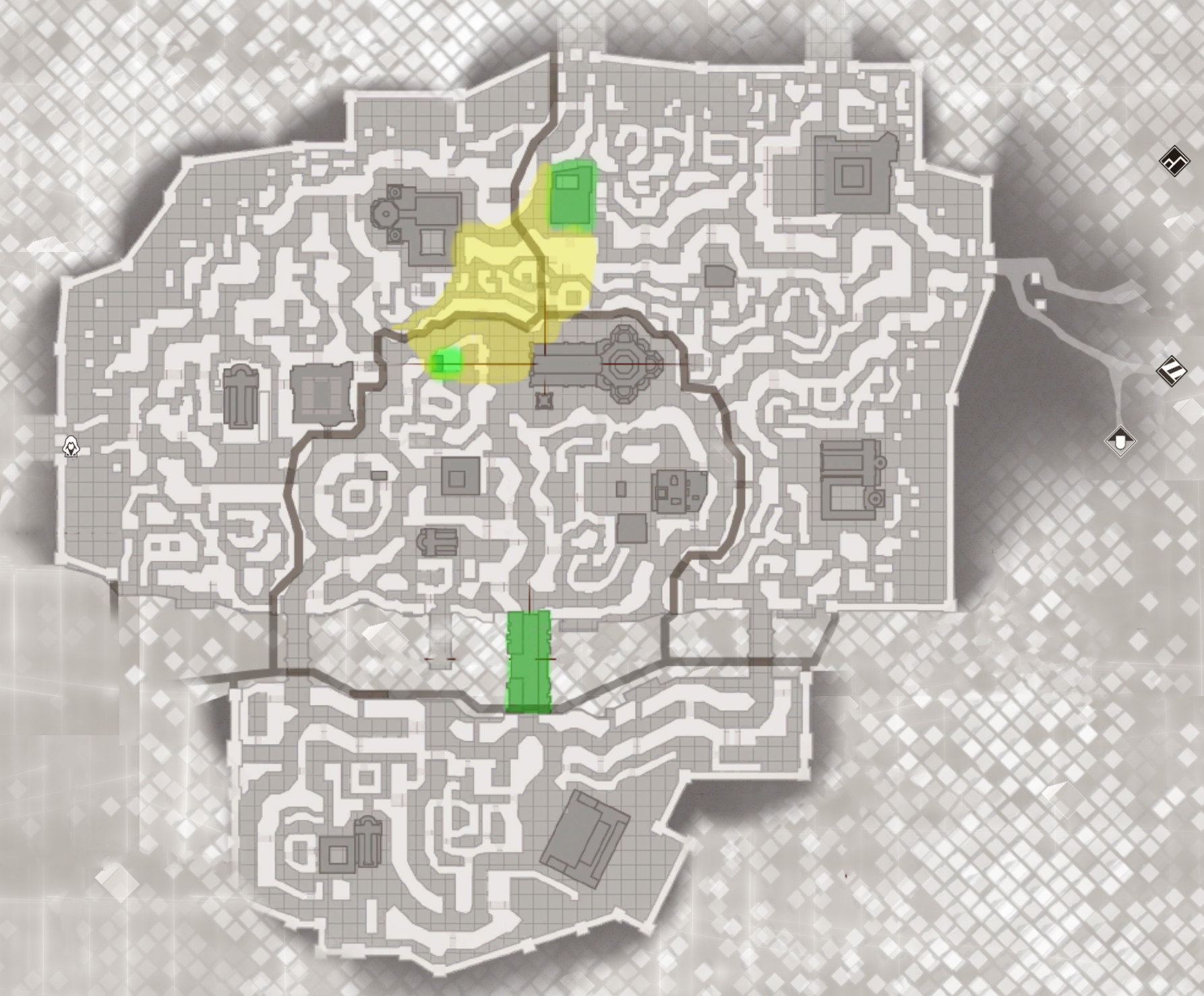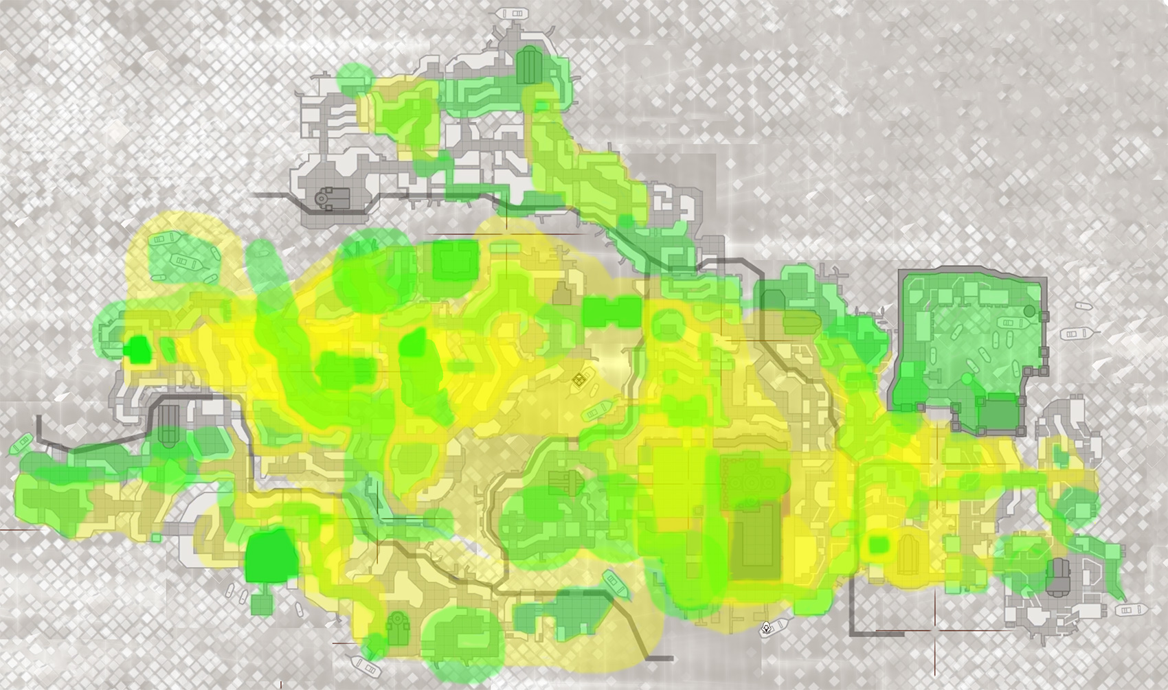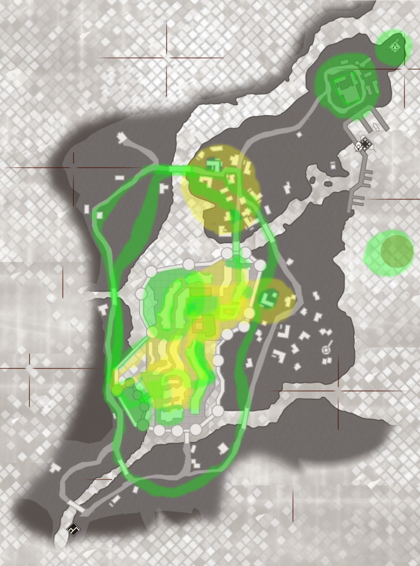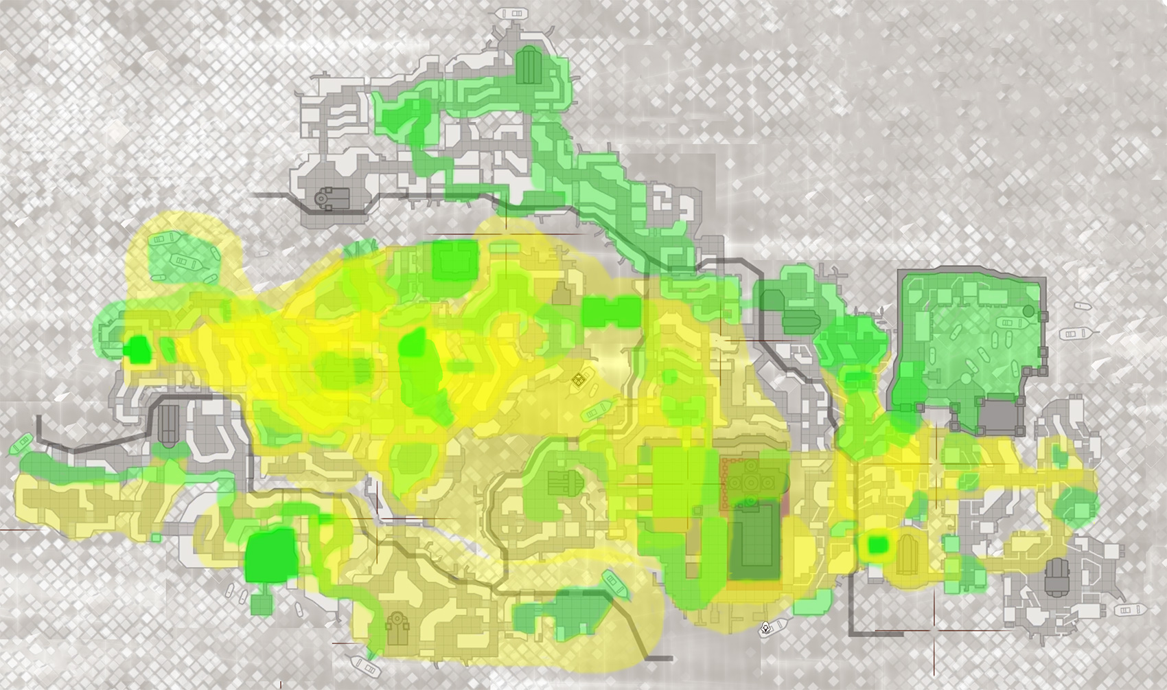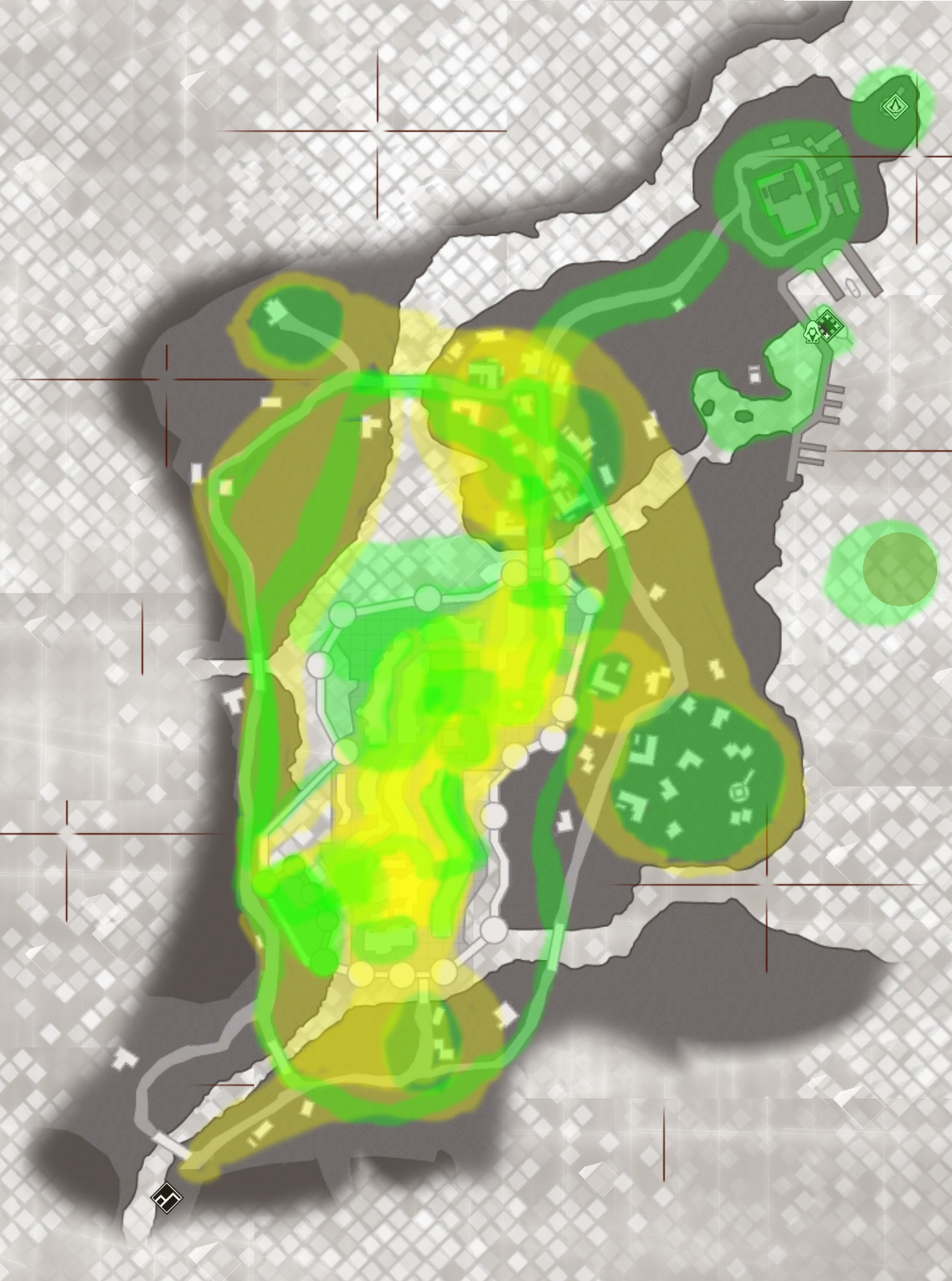 Green – Area that the player will pretty much 100% visit and explore because the mission design revolves around it (be it an infiltration sandbox area, search area, a particular path of a character we need to follow, etc.)